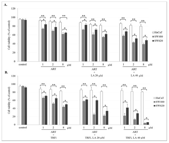 Effect of ART alone and ART with LA addition (A), ART-TRFi alone and ART-TRFi with LA addition (B) on viability of SW480, SW620, and HaCaT cells. Cells were treated for 72 h with various concentrations of tested compounds ART (1, 2, and 8 μM), LA (20 and 40 μM) and TRFi (50 μM). Cells viability was assessed by TB assay. Data are expressed as means ± SD. ** p < 0.001 as compared to control, * p < 0.001 as compared to HaCaT.