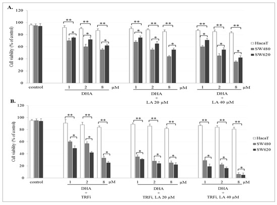 Effect of DHA alone, DHA with LA addition (A), DHA–TRFi alone and DHA-TRFi with LA addition (B) on viability of SW480, SW620, and HaCaT cells. Cells were treated for 72 h with various concentrations of tested compounds ART (1, 2, and 8 μM), LA (20 and 40 μM) and TRFi (50 μM). Cells viability was assessed by TB assay. Data are expressed as means ± SD. ** p < 0.001 as compared to control, * p < 0.001 as compared to HaCaT.
