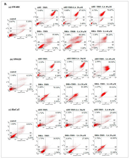 To assess in vitro the anticancer mechanism of action, the effect of ART or DHA (2 µM) with/without LA (20, 40 µM) and TRFi on early and late apoptosis was provided by flow cytometry analysis (Figure 4A).