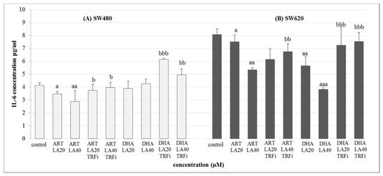The effect of ART, DHA, and LA with or without TRFi on IL-6 levels in (A) SW480 and (B) SW620 cancer cells. Cells were incubated for 72 h with studied compounds at their IC50 concentrations. IL-6 levels in culture medium were measured by ELISA test. Data are expressed as means ± S.D. from three independent experiments performed in triplicate. aaa p < 0.001, aa p < 0.01, a p < 0.05 as compared to the control and bbb p < 0.001, bb p < 0.01, b p < 0.05 as compared to the ART or DHA with LA 20 or 40.