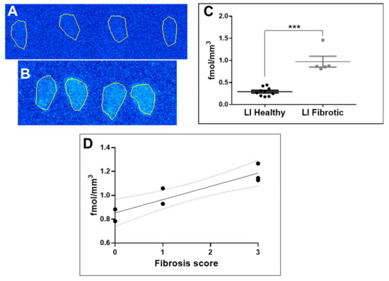 The autoradiography of the cryosections of fibrotic mouse liver demonstrated a distinct heterogeneous uptake of the radioactivity (Figure 2B). The uptake in the diseased tissue (five independent measurements á 4–8 replicates) was higher than that in the healthy tissue (Figure 2A,B) with statistical significance (Figure 2C). The tracer binding in the liver cryosections investigated via autoradiography correlated with the grade of fibrosis estimated by the Sirius Red staining (Figure 2D). The background uptake was subtracted from the tissue uptake for the calculations of the binding site density (fmol/mm3).