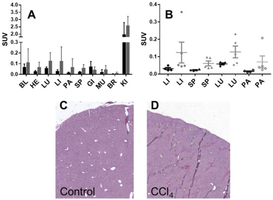 Organ distribution of 68Ga]Ga-NO2A-[Nle13]-Col in healthy mice (black bars (A) and points (B)) and mice with induced liver fibrosis (grey bars (A) and points (B)). BL: blood; HE: heart; LU: lungs; LI: liver; PA: pancreas; SP: spleen; MU: muscle; BM: red bone marrow; BR: brain; KI: kidneys. Representative Sirius Red staining images (4x magnification) of liver sections from mice with CCl4-induced fibrosis (C) and healthy controls (D).