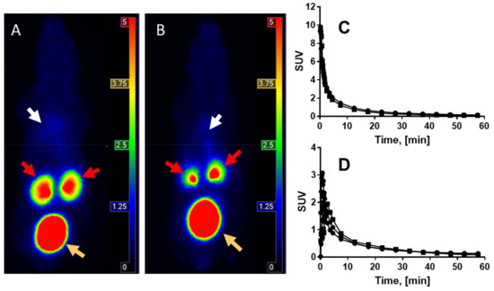 The rat SUVs were translated into a percentage of injected activity (%IA, Equation (3)) for human organs according to Equation (3) (Table S3), where SUVA is the SUVs of the rat organs; gorgan and kgTBweight are, respectively, standard organ weight and standard total body weight of a human. The standard organ masses and total-body weight values were obtained from the OLINDA software (organ level internal dose assessment code, Vanderbilt University, USA, 2007).
