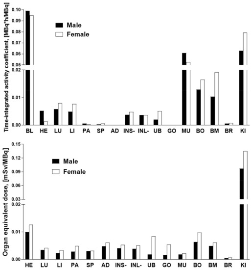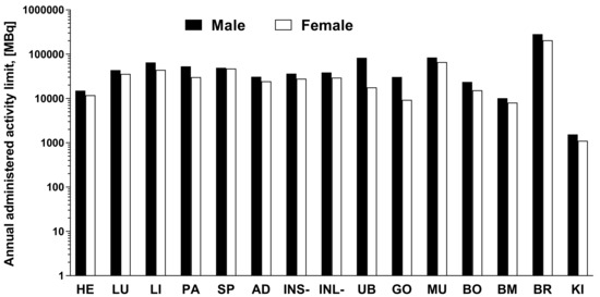 The data of the rat organ distribution was extrapolated to human organs assuming a similar biodistribution pattern [19]. The Time-integrated activity coefficient (TIAC), equal to the number of disintegrations (MBq-h/MBq) for each organ is presented in Figure 5. The highest TIACs were observed for the blood, kidney, muscle, bone, and bone marrow, in both genders. The effective dose and organ equivalent dose (mSv/MBq) were calculated using the OLINDA program with the TIACs as the input data. The tissue weighting factors recommended by the ICRP Publications 60 and 103 [20,21] were used for the calculations. This program gives consideration for the type of radiation. The remaining body TIAC was defined measuring the radioactivity in the remaining carcass, which refers to bulk radioactivity and is not related to the biodistribution or excretion of [68Ga]Ga-NO2A-[Nle13]-Col. Effective doses calculated by OLINDA, accounting for the radioactivity fraction in relation to the theoretical maximum TIAC, were 0.011 and 0.013 mSv/MBq, respectively, for male and female. The only dose limiting organ was the kidney. All other organs received a dose lower than 0.02 mSv/MBq (Figure 5). According to the European Nuclear Society, the annual limit for the kidney is 150 mSv. Thus, the annual injected dose of [68Ga]Ga-NO2A-[Nle13]-Col in MBq limited by kidney uptake would correspond to approximately 1100 MBq and 1500 MBq, respectively, for female and male. The estimated absorbed doses (mGy/MBq) for selected organs are summarized in Table 1, and dose limits of [68Ga]Ga-NO2A-[Nle13]-Col with respect to each organ are presented in Figure 6.