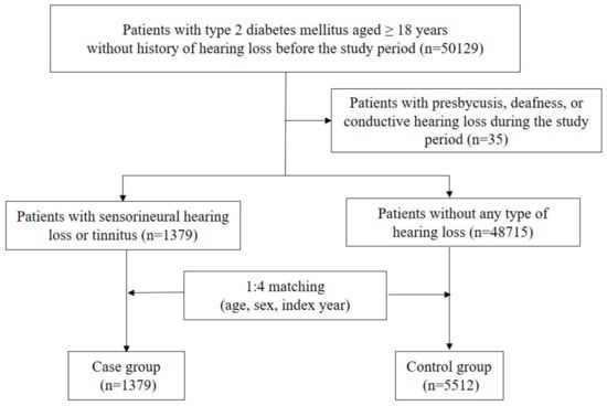 Among 50,129 patients who were eligible for this study, 35 patients were excluded due to presbycusis, deafness, or conductive hearing loss during the study period (Figure 1). Of 50,094 patients, 1379 cases were newly diagnosed with SNHL or tinnitus during the study period. Approximately three-quarters of cases were first diagnosed by otolaryngologists, and most patients underwent pure tone audiometry and speech audiometry. Cases were matched to 5512 controls based on age, sex, and index year. As shown in Table 1, index year, age, and sex were well balanced between the two groups. Among other factors, a glomerular filtration rate (GFR) less than 30 mL/min/1.73 m2, total cholesterol 240 mg/dL or higher, chronic kidney disease, causative diseases of hearing loss, and ototoxic medication use were significant factors for the risk of SNHL or tinnitus.