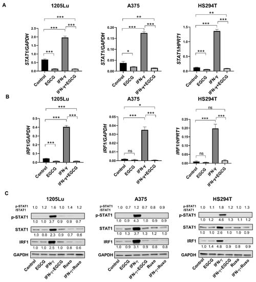 EGCG inhibits IFN-γ-induced JAK-STAT signaling. (A,B) qRT-PCR analysis of STAT1 (A) and IRF1 (B) in 1205Lu, A375 and HS294T cells after treatment with 0.1% DMSO (control), 10 µM EGCG (EGCG), 10 ng/mL IFN-γ (IFN-γ) or a combination of IFN-γ and EGCG (IFN-γ + EGCG). GAPDH served as a control. (C) Immunoblot analysis of p-STAT1, STAT1 and IRF1 in 1205Lu, A375 and HS294T cells treated with 0.1% DMSO (control), 10 µM EGCG (EGCG), 10 ng/mL IFN-γ (IFN-γ), a combination of IFN-γ and EGCG (IFN-γ + EGCG), 10 µM ruxolitinib (Ruxo) or a combination of IFN-γ and ruxolitinib (IFN-γ + Ruxo). GAPDH served as a control. The band densities of proteins were quantified with image J and normalized to GAPDH. p-STAT1 to STAT1 ratio was calculated and normalized to control. Data are representative of 2 independent experiments and expressed as the mean ± S.D., n = 3 ns, p > 0.05; * p < 0.05; ** p < 0.01; *** p < 0.001.