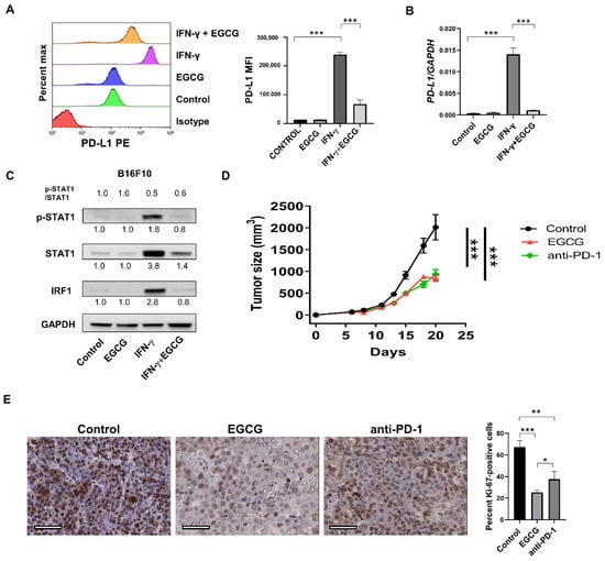 Since EGCG downregulated PD-L1/PD-L2 expression in human metastatic melanoma cells in vitro, we speculated that EGCG treatment in mice could evoke a similar response to anti-PD-1 antibody therapy. To test this, we used mouse metastatic melanoma cell line B16F10, which has been reported to be partially responsive to anti-PD-1 antibody therapy [], implanted in syngeneic C57BL/6 mice. PD-L2 expression has been reported to be minimal in many murine tumor models, including B16F10 cells, even after IFN-γ stimulation []. Therefore, we analyzed only PD-L1 expression in B16F10 melanoma cells. First, we evaluated the in vitro effect of EGCG on PD-L1 expression in B16F10 cells. In agreement with the results from human metastatic melanoma lines, EGCG treatment reversed the IFN-γ-induced PD-L1 upregulation at both protein (Figure 3A) and mRNA (Figure 3B) levels. Similarly, the EGCG treatment inhibited the IFN-γ-induced STAT1 phosphorylation and its downstream target IRF1 (Figure 3C and Figure S3A).