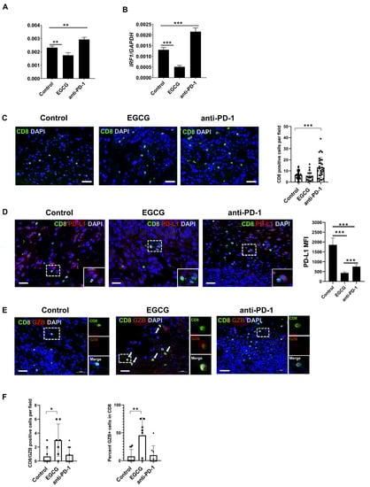 To test whether the mechanism behind the in vivo effects of EGCG was similar to that observed in vitro, we analyzed B16F10 tumor samples for STAT1 and IRF1 expression. In agreement with the in vitro effects, treating B16F10 tumors with EGCG in vivo downregulated STAT1 and IRF1 mRNA levels (Figure 4A,B). In contrast, the anti-PD-1 antibody treatment increased the expression of STAT1 and IRF1 in the tumors. The opposing effects of EGCG and the anti-PD-1 antibody treatment on JAK-STAT signaling could be explained by their differential mechanisms of action and effects on T-cell activation and function. Figure 1, Figure 2 and Figure 3 show that EGCG directly inhibits PD-L1 expression and JAK-STAT signaling in tumor cells, which would re-activate T cells. In contrast, the anti-PD-1 antibody treatment directly blocks the PD-L1-mediated inhibitory signals to T cells. Therefore, we compared the effects of EGCG and the anti-PD-1 antibody treatment on CD8+ cells (Figure 4C–F).