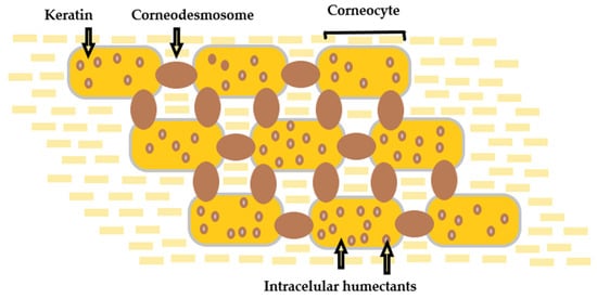 The outermost sublayer of the epidermis, named stratum corneum (SC) (10–20 µm), plays a fundamental role as the body’s first and main physical skin barrier from external menaces [19,20,21]. It consists of corneocytes—specific cells that are the essential limiting factor for permeation through the skin, restricting the passage of molecules significantly larger than 500 Da [22]. The SC functions as a two-compartment system organized in a “brick and mortar” formation, with an extracellular matrix of lamellar membranes [23]. The structure of the stratum corneum is schematically represented in Figure 2.