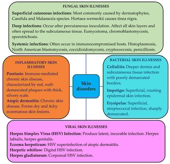 The skin can be affected by various pathological changes, i.e., inflammatory, neoplastic, traumatic, hormonal, degenerative, and even hereditarily determined [30]. Infectious skin diseases such as bacterial, fungal or viral affect people and cause various dermatological problems. Chronic inflammatory skin diseases such as atopic dermatitis, allergic contact dermatitis, psoriasis, etc., are a consequence of infiltration of inflammatory T cells [31]. The schematic representation of various skin disorders is shown in Figure 3 [32,33,34,35,36,37,38,39,40,41,42,43].