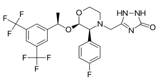 In appearance, APR is a white to off-white, non-hygroscopic, crystalline solid powder. The molecular weight of APR is 534.4 g/mol and its chemical structure is 5-(((2R,3S)-2-((1R)-1-(3,5- bis(trifluoromethyl)phenyl)ethoxy)-3-(4-fluorophenyl)4-morpholinyl)methyl)-1,2-dihydro-3H-1,2,4-triazol-3-one [4]. The structure of APR is given in Figure 1.