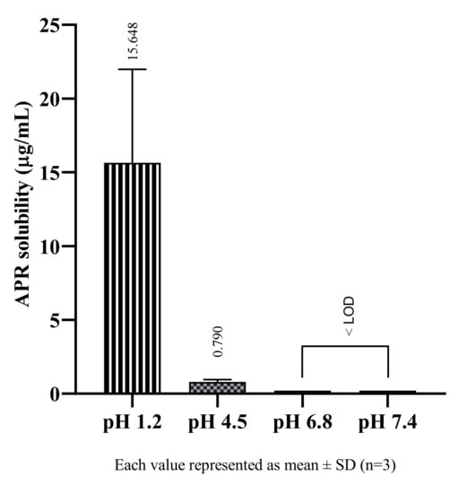 Studies conducted in buffer solutions to determine the solubility of APR in physiological environments, it was observed that APR showed pH-dependent solubility and had higher solubility in acidic environments. Since APR is a weakly basic drug, it is an expected result. Weakly basic drugs are ionized in acidic mediums, so their solubility increases [21]. The solubility of APR in buffers are shown in Figure 2. The physiological pH in which APR has the best solubility is pH 1.2 at 37 °C. However, the result shows that APR is practically insoluble even at low pH. As the pH value increased, the solubility of APR decreased, and it could not be determined as it fell below LOD in pH 6.8 and pH 7.4.