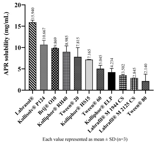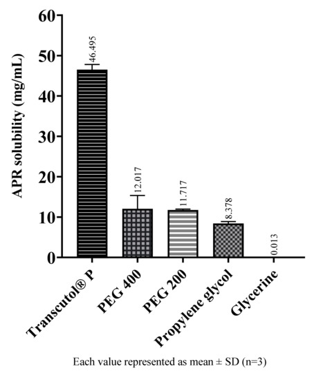 The solubility of APR in cosolvents are shown in Figure 3. Among the cosolvents, Transcutol® P dissolves a much more amount of APR than the others. Transcutol® P is a known excipient and is frequently used as a cosolvent since it is a capable solubilizer for many drugs with low water solubility.