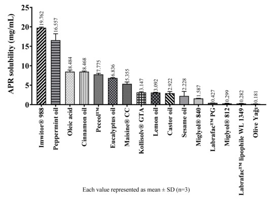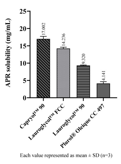The solubility of APR in various oily excipients are shown in Figure 6.