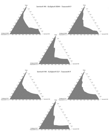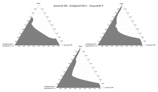 Pseudo ternary phase diagrams showed that the area of nanoemulsion (the gray shaded area) was highest in formulations prepared with Imwitor® 988–Kolliphor® RH40 –Transcutol® P mixture at a 3:1 Smix ratio. For Imwitor® 988, the highest total area was obtained with Kolliphor® RH40. This surfactant can nanoemulsify up to 30% Imwitor® 988 in formulations. Areas of the pseudo ternary phase diagrams are shown in Table 3.