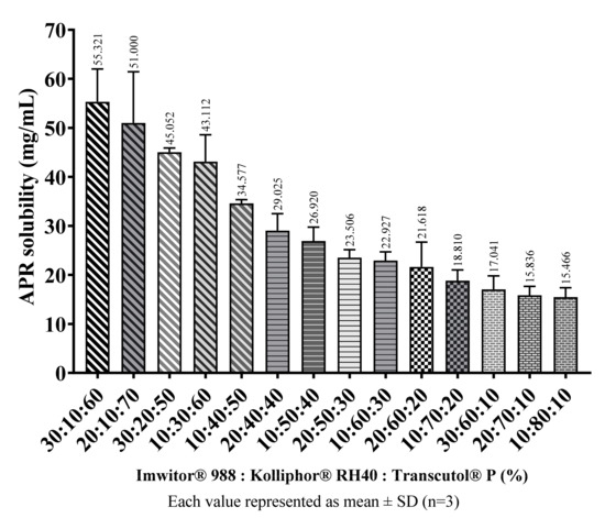 APR amounts that can be loaded into blank formulations considered suitable were determined as described in the methods (Equilibrium solubility of APR) section. The main factor determining the solubility of APR in formulations was the ratio of cosolvents in the formulations. In general, as the amount of Transcutol® P in the formulation increased, the amount of APR that the formulation can dissolve also increased. The amount of APR in saturated SNEDDS preconcentrates are shown in Figure 8.