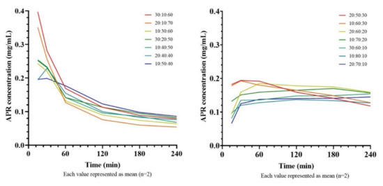 As the cosolvent ratio decreases (<40%) and the surfactant ratio increases (>50%), the decline in the APR concentration slows down. Formulations with a high cosolvent content stabilized at a concentration of about 0.10 mg/mL after 4 h, while formulations with a lower content of cosolvents stabilized at a concentration of about 0.15 mg/mL. The mean areas under the concentration-time curves (AUC) are shown in Table 6.