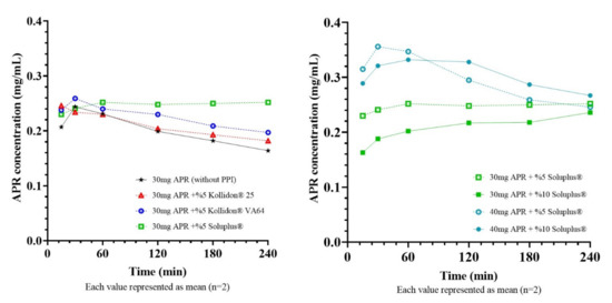 Since the nanoemulsions formed after the dilution of SNEDDS are not thermodynamically stable, it is expected that the active substances will precipitate over time. It has been shown that the precipitation rate of the drug in Type III-B and Type-IV systems is generally higher than in Type-II and Type III-A systems [35]. The study conducted to compare the amount of precipitated APR in time in various formulations containing different amounts of APR is shown in Figure 9. It is clear that the concentration-time curves start from high concentration levels in formulations with a high cosolvent ratio, but also concentration decreases rapidly. That could be explained by if the cosolvents considerably contribute to drug solubilization, dilution of SNEDDS will cause the solvent capacity to decrease, leading the drug to precipitate [36].