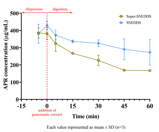 Concentration of APR during digestion of SNEDDS and super−SNEDDS.