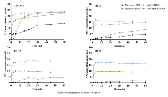 In vitro drug release test was conducted by using a dissolution tester (Pharmatest, Hainburg, Germany). Dissolution studies of APR-loaded solid SNEDDS were carried out using the USP paddle method (Apparatus II) at 100 rpm and 37 °C. An amount of 900 mL of 2.2% sodium lauryl sulfate in distilled water, pH 1.2 HCl buffer, pH 4.5 acetate buffer, and pH 6.8 phosphate buffer were used as the dissolution mediums. Further, 1 mL samples from dissolution vessels were withdrawn at 1,3, 5, 10, 15, 20, 30, 45, and 60 min and filtered through a 0.45 µm syringe filter. The dissolution medium was made up to 900 mL with a fresh medium to maintain a constant volume. APR concentrations were determined by the validated HPLC method without any dilution. Dissolution tests of prepared formulations, marketed capsules, and APR powder were performed for comparison. Each dissolution vessel contained the equivalent of 20 mg of APR.