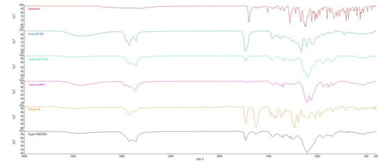 FTIR measurements were carried out using an infrared spectrophotometer (Perkin Elmer Spectrum Two, USA) in attenuated total reflectance mode fitted with a ZnSe crystal. The scanning range was 400–4000 cm−1, and the resolution was 2 cm−1. The spectra of the APR and various formulations were recorded.