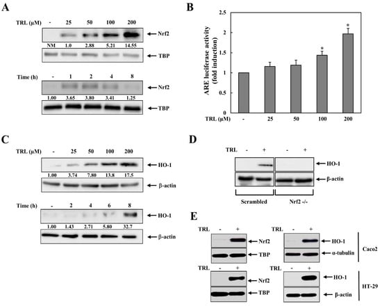 2.1. TRL Activates the Nrf2-HO-1 Pathway in Human Colon Carcinoma Cells