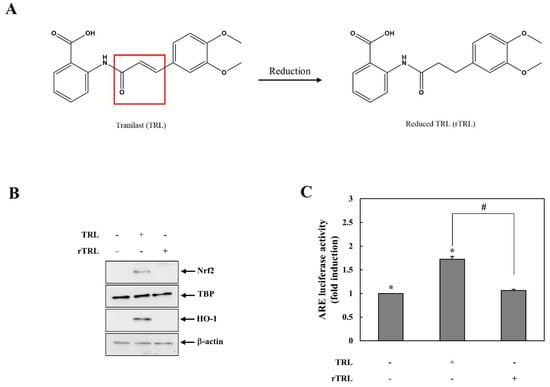 Chicago/Turabian StyleJeong, Seongkeun, Changyu Kang, Sohee Park, Sanghyun Ju, Jin-Wook Yoo, In-Soo Yoon, Hwayoung Yun, and Yunjin Jung. 2021. "Eletrophilic Chemistry of Tranilast Is Involved in Its Anti-Colitic Activity via Nrf2-HO-1 Pathway Activation" Pharmaceuticals 14, no. 11: 1092. https://doi.org/10.3390/ph14111092