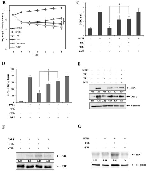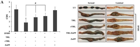 2.4. TRL Amelioration of Rat Colitis Is Partly Compromised by Either Chemical Reduction or an HO-1 Inhibitor