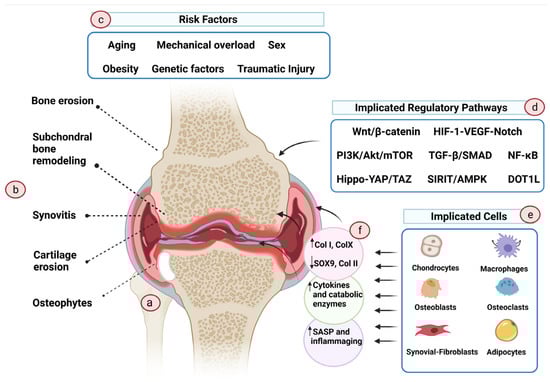 Pathogenesis of osteoarthritis. OA is a complex disease with a wide range of risk factors and causes. (a) OA knee. (b) OA affects not only the cartilage tissue but also the surrounding tissues, causing modulation of the subchondral plate, inflammation of the synovial tissue, and erosion and osteophyte formation at the supporting bone. (c) The primary causative event of OA is largely unknown. Aging, chronic mechanical overload, traumatic injury, genetic variables, sex, and associated hormonal variation are some of the risk factors that have been proposed to increase the vulnerability to OA. (d) Multiple regulatory pathways are involved in OA onset and progression, but not all are necessarily implicated in all phenotypes of the disease. (e) Cells in the affected tissues actively participate in the disease’s initiation and propagation. (f) During OA, these cells change phenotype and, as a result, exhibit altered transcriptome profiles that promote an endless cycle of inflammation and tissue deterioration. (Created with BioRender.com on 11 August 2021).