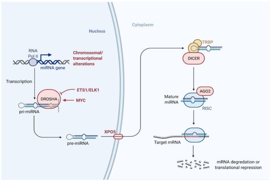 miRNAs consist of approximately 19–24 nucleotides and originate from precursors with a characteristic hairpin-shaped loop structure [132]. miRNAs have a phosphorylated 5′-end and a 3′-end with two hydroxyl groups and are normally processed by two successive steps in humans: first, in the nucleus by an RNase III called Drosha, followed by a second RNase III called Dicer in the cytoplasm (Figure 2). These enzymes cut the genome-encoded stem-loop precursors into the mature miRNA [133]. The mature miRNA attaches to an argonaute (AGO) protein to form the core of the RNA-induced silencing complex (RISC), which subsequently interacts with target mRNAs to regulate gene expression.