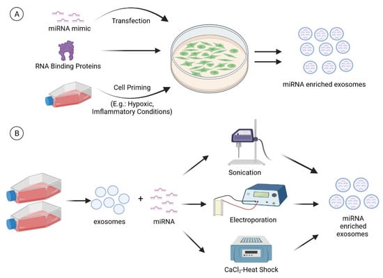 miRNA enrichment can be performed via (A) cell modification or (B) direct loading of miRNAs into exosomes. For cell modification, a miRNA mimic is transfected into the cells. In addition, RNA binding proteins and cell priming (e.g., hypoxia and inflammatory cytokines) strategies can also be employed to modulate the miRNA cargo of exosomes. Techniques such as sonication, electroporation, and CaCl2-heat shock can be used to load the miRNAs directly into the exosomes. (Created with BioRender.com on 28 July 2021).