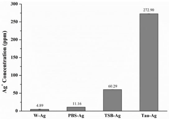As shown in Figure 1, the silver contents of four different matrixes were profiled using ICP-MS analysis. The silver content of water-induced silver (W-Ag) was revealed to be 4.89 ppm, while that of PBS-Ag was 11.16 ppm. A higher silver content was found in TSB-Ag (60.29 ppm), whereas among the four matrixes, the silver content of 272.90 ppm for Tau-Ag was found to be the highest, suggesting that taurine inducing silver from MBG-Ag had a better potency. In a previous study, B.W. Stuart et al. released silver ions from phosphate bioactive glasses in water, and the concentration of silver ions dramatically increased in 4 h, but slowed between 4 h and 12 h [].