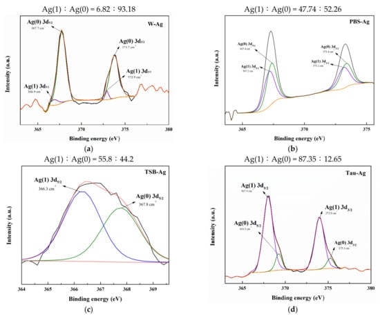 XPS results of (a) W-Ag, (b) PBS-Ag, (c) TSB-Ag, and (d) Tau-Ag patterns.