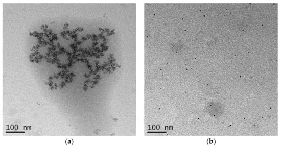 TEM images of (a) TSB-Ag and (b) Tau-Ag. Micrographs were captured at 25,000× magnification.