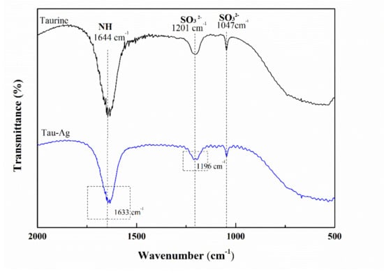 To further understand the release of Ag ions in taurine, FTIR was used to analyze the frequency shift of Tau-Ag. The frequency shifts of sulfonic acid (SO32−) and the NH2 vibration of the ligand from 1201 and 1644 cm−1 to lower frequencies (Figure 4) confirmed its involvement in co-ordination []. The -NH and -SO32− groups of taurine might have some affinity with silver [], while the percentages of unbound Ag, Ag–O, Ag–N, and Ag–S were found to be 2, 71, 11, and 16, respectively []. It could be expected that the SO32− and NH2 groups may have some level of affinity with silver.