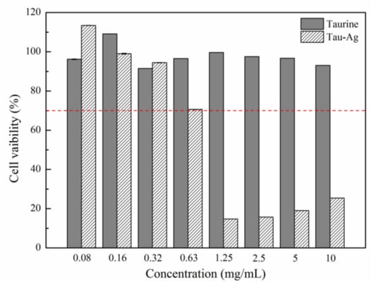 An in vitro toxicity test was performed using an MTS assay with the CellTiter-96® aqueous cell proliferation kit (Promega, Madison WI, USA). Based on the American National Standard ISO 10993-5 [], NIH-3T3 fibroblast cells (5 × 104) were plated in 96-well plates and treated with different concentrations of taurine and Tau-Ag (0.08, 0.16, 0.32, 0.63, 1.25, 2.5, 5, 10 mg/mL) in serum-free medium (DMEM) at 37 °C for 24 h. The cells of the control group were treated without any materials, but with the same procedure. After incubation, 20 μL of MTS solution was added to each well of the 96-well assay plate containing the samples in 100 μL of culture medium, then the cells were incubated at 37 °C for a further 2 h. The absorbance of the well contents was detected at 490 nm using a Multiskan Sky Microplate Spectrophotometer (Thermo Fisher Scientific, Waltham, MA, USA). Cell viability was calculated using the following equation: