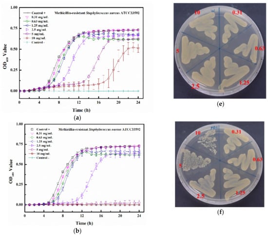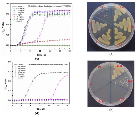 Cultures from growth curve analyses were harvested as samples for colony-forming assays. One loopful of 1 μL cultural sample was spread onto TSA plates using a standard loop (BD, DifcoTM, Cat. No. 220215). The TSA plates were then incubated at 37 °C for 24 h. The MBC was determined as the lowest concentration of materials (mg/mL) that showed no appearance of any bacterial colony on the plate.