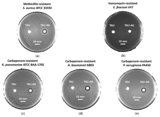 Disk diffusion analysis for (a) methicillin-resistant S. aureus (MRSA) ATCC 33592, (b) vancomycin-resistant E. feacium (VRE) clinical isolate V47, (c) carbapenem-resistant K. pneumoniae (CRKP) ATCC BAA-1705, (d) carbapenem-resistant A. baumannii (CRAB) clinical isolate AB03, and (e) carbapenem-resistant P. aeruginosa (CRPA) clinical isolate PA450. The scale represents a 10 mm length. The Tau disks contain 10 μL of 2% taurine solution each as a control, while the disks of Tau-Ag were dipped in 10 μL of taurine-induced silver ions (20 mg/mL).