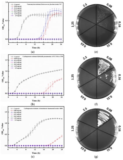 As suggested by the results of the growth curve and colony-forming testing, an observable inhibition zone was noticed for MRSA ATCC 33592, with a diameter of 10 mm (Figure 8a). An antibacterial effect was found for VRE strain V47, with an inhibition zone of 11 mm (Figure 8b). Furthermore, the inhibitory activities of Tau-Ag were also demonstrated for carbapenem-resistant strains, including CRKP with a 10 mm inhibition zone (Figure 8c), CRAB with an 11 mm one (Figure 8d), and CRPA with a 10 mm one (Figure 8e). In view of the results from the disk diffusion assays, the kinetic antibacterial activities and colony-forming analyses of Tau-Ag against VRE, CRKP, CRAB, and CRPA were further examined.