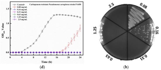 Growth curve results for Tau-Ag against (a) vancomycin-resistant E. feacium (VRE) clinical isolate V47, (b) carbapenem-resistant K. pneumoniae (CRKP) ATCC BAA-1705, (c) carbapenem-resistant A. baumannii (CRAB) clinical isolate AB03, and (d) carbapenem-resistant P. aeruginosa (CRPA) clinical isolate PA450. The results represent absorbance at 600 nm, with dots as means and bars as SD. Colony-forming tests results for (e) VRE V47, (f) CRKP ATCC BAA-1705, (g) CRAB AB03, and (h) CRPA PA450.