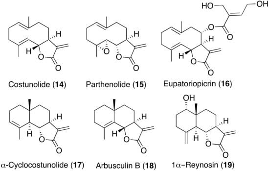 - Matos, M.S.; Anastácio, J.D.; Dos Santos, C.N. Sesquiterpene lactones: Promising natural compounds to fight inflammation. Pharmaceutics 2021, 13, 991. [Google Scholar] [CrossRef]