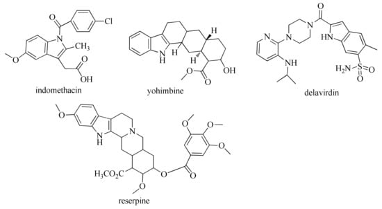 Indole, an aromatic heterocyclic organic compound, has attracted the interest of scientists since it possesses a wide variety of pharmacological properties, such as analgesic [3,4], anti-inflammatory [3,5,6], antimicrobial [7,8,9,10], anticancer [11,12,13], anticonvulsant [14,15] and antiviral [16,17], COX-inhibitory [18,19], antidiabetic [20,21], and antitubercular [22,23] activities. Furthermore, indole moiety is present in some drug molecules, such as: indomethacin; yohimbine, an approved drug for the treatment of sexual disorders [24,25]; delavirdine, anti-HIV drug [26]; reserpine (Figure 1), and many others. Indole-based pharmaceuticals represent a very important class of therapeutic molecules and will probably replace many existing pharmaceuticals in the future [27].