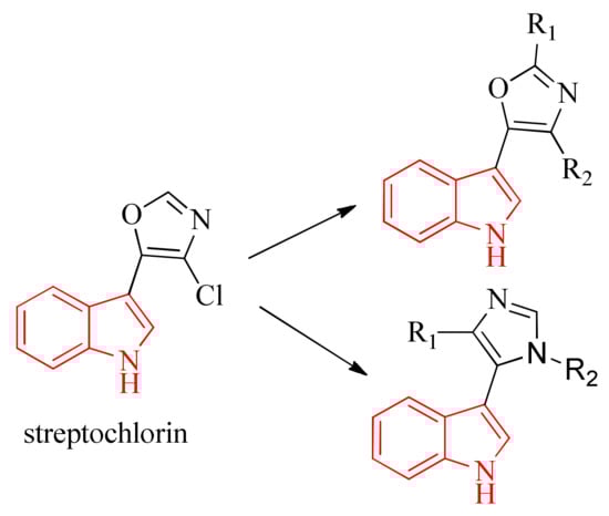 On the other hand, it is well known that natural products have served as a powerful source for drug discovery. There have been many important drugs developed from plants and microorganisms [28]. One of them is streptochlorin, a bioactive compound first isolated from marine Streptomyces sp. by Japanese scientist H. Watanabe in 1988 [29]. Since streptochlorin lacks antifungal potency in low concentrations, Zhang et al. [30] and Gao et al. [31] made different structural modifications to it and showed the importance of an indole ring in the structure of streptochlorin, replacing the oxazole ring with imidazole as a bioisostere to discover novel streptochlorin analogues (Figure 2).