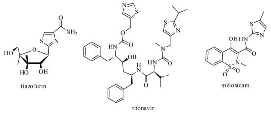 Another interesting core is thiazole. Its derivatives have been reported to possess a wide range of biological properties, such as antimicrobial [32,33,34], anticancer [35,36,37], anti-inflammatory [38,39,40], antiviral [41,42], anti-HIV [43,44], antidiabetic [45,46], carbonic anhydrase inhibitory [47,48,49], antitubercular [50,51], and many other [52,53,54] activities. Furthermore, penicillin derivatives [55]; bleomycin [56]; tiazofurin [57], an antineoplastic drug; vitamin B1 [58]; ritonavir, an approved drug for the treatment of HIV [59]; and meloxicam [60] (Figure 3) are also very important thiazole-containing agents approved for human use.