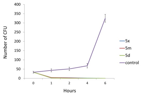 The bactericidal nature of three more active compounds, 5d, 5m, and 5x against P. aeruginosa was determined by a time-kill curve study. The treatment with the MBC of all selected compounds drastically reduced the number of P. aeruginosa CFU (Figure 4). Even after 1 h of treatment with compounds 5d, 5m, and 5x, the number of bacterial CFU was reduced by more than 90%, while the 2-h treatment induced a reduction of more than 94%. After 6h, none of the P. aeruginosa colonies treated with the selected compounds (5d, 5m, and 5x) remained viable.
