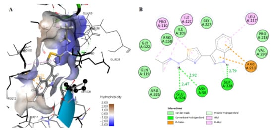Binding mode in 3D (A) and 2D (B) of compound 5x into the enzyme-active side of E. coli MurB (PBD: 2Q85). Green dotted lines represent the hydrogen bonds; pink-colored dotted lines and light green spheres represent pi-pi and hydrophobic interactions, respectively.