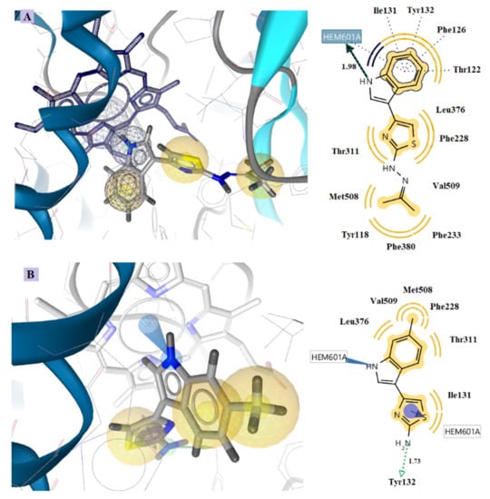 Docking studies revealed that all the tested compounds may bind CYP51Ca enzymes in an analogous mode to that of reference drug ketoconazole (Figure 6 and Figure 7). Compound 5x showed the lowest free binding energy of −12.55 kcal/mol. This value is particularly due to the hydrogen bond formation between the nitrogen atom of the indole ring and the heme group of the enzyme (distance 1.98 A, Figure 6A). Hydrophobic interactions with the residues, Tyr118, Thr122, Phe126, Ile131, Tyr132, Phe288, Phe233, Thr311, Leu376, Phe380, Met508, and Val509 also contribute to the stability of the complex enzyme compound.
