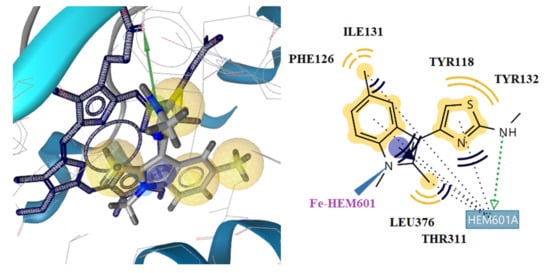 According to the docking studies, all the tested methylindole-based thiazolidinone derivatives may bind to CYP51Ca enzymes in an analogous mode to that of reference drug ketoconazole (Figure 8). Compound 5t showed the lowest free binding energy, −11.28 kcal/mol. This value is particularly due to the hydrogen bond formation between the nitrogen atom of the methylindole ring of the compound and the hem group of the enzyme (distance 2.53 A, Figure 7). Hydrophobic interactions with the residues, Tyr118, Phe126, Ile131, Tyr132, Thr311, Leu376, and hem also contribute to the stability of the complex enzyme compound.