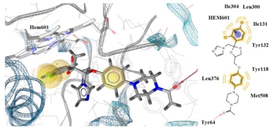 Docking of ketoconazole to CYP51Ca receptor. Red and green dotted arrows indicate H-bond, blue arrows aromatic interactions and yellow spheres hydrophobic interactions.