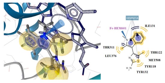 Furthermore, compounds 5t and 5r are placed inside the enzyme on the side of the hem group, binding to the Fe of hem through hydrophobic and aromatic interactions. (Figure 7 and Figure 9). However, compounds 5t and 5r form more stable complexes with the enzyme due to their stronger interaction with the Fe of hem than the interaction observed between the benzene of ketoconazole and hem (Figure 8). This is probably the reason why these compounds have better antifungal activity than ketoconazole.